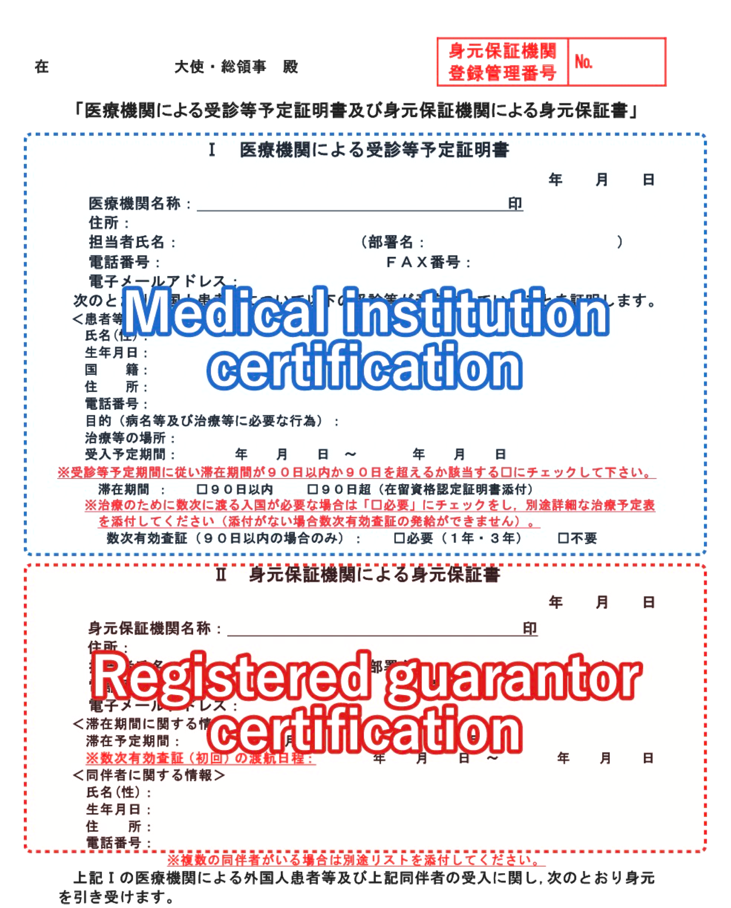 Certificate from a medical institution about the planned medical services and references from a guarantor in Japan